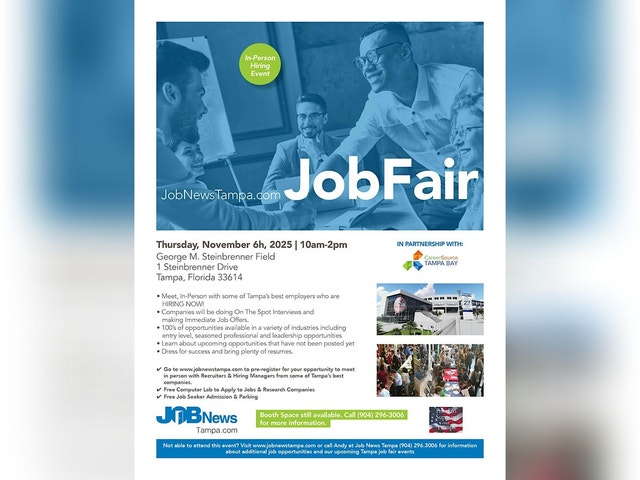 Tampa Hiring Event Thursday November 6th at 10 am!! ** 20+ Local Companies will be hiring for 100’s of JOBS in a Variety of Industries ** Job News Tampa, along with our SPONSOR - CoverageX, in Partnership with CareerSource Tampa Bay, will be hosting a Hiring Event from 10 am to 2 pm on Thursday November 6th, 2025 at George Steinbrenner Field located at One Steinbrenner Drive, Tampa, FL 33614 [http://r20.rs6.net/tn.jsp?t=5bc9lm4ab.0.0.bgwmlnrab.0&id=preview&r=3&p=https%3A%2F%2Fwww.google.com%2Fmaps%2Fplace%2F1000%2BWater%2BSt%2C%2BJacksonville%2C%2BFL%2B32204%2F%4030.3278452%2C-81.6745819%2C17z%2Fdata%3D%213m1%214b1%214m5%213m4%211s0x88e5b76bb9c5c29b%3A0x57df8557ecccb39a%218m2%213d30.3278452%214d-81.6723932] ** Companies have immediate hiring needs and many will be Interviewing “AND” Hiring On The Spot ** This is a unique opportunity for job seekers to meet, in-person and make personal connections with recruiters and hiring managers from some of Tampa’s best companies and organizations. Job Seekers are encouraged to Pre-Register - Tampa Job Fair [https://www.jobnewstampa.com/]. By registering and uploading your resume now, you can apply to jobs in advance as well as allow companies exhibiting at the job fair to review your information in advance, increasing your employment opportunities. ** Vendor space is still available. Call District Manager Andrew Lemister at (904) 296-3006 for additional information about recruiting new talent at this job fair or any of our 2026 recruiting events around the country. ** Free Computer Lab to research companies, apply to jobs and customize your resume** ** Bilingual (Spanish) job seeker assistance will be available to help you and your new job ** ** Free job seeker admission and Free parking is available** Companies and organizations will be looking to fill " 100’s of Positions in a Variety of Industries" including the following: SPONSOR: CoverageX: Join CoverageX and be part of a fast-growing team that’s redefining what care and service really mean. We’re hiring Pre-Qualifying Screeners ready to grow with us Partners: 84 Lumber: Administrative Coordinator, Manager Trainee, Field Operations Manager, Non - CDL Driver, Yard Associates CareerSource Tampa Bay: We will have our computer lab available for job seekers to research companies and apply to jobs at the job fair. We will also have a recruiter onsite to offer complementary resume review as well. Center for Technology Training: Instructors – A+, Net+, Sec+; Instructors – Microsoft Azure AZ 900 104; Instructors – Cisco, CCNS, CISSP; Instructors – Microsoft DP 900, 300, 203, 305; Instructors – PMP, CEH; Instructors – Social Media, SEO, Web Foundations Computer Coach: Paid Tech Apprenticeships, Free IT Certification Training, Project Management (PMP), Cybersecurity, Data Analytics Hillsborough County Sheriff's Office: Law Enforcement Deputy Trainee, Detention Deputy Trainee, Senior Aircraft Mechanic/Inspector, Part-Time Vocational Training Instructor, Equipment Mechanic II, Refrigeration/Air Conditioning Mechanic III JA Edwards of America, Inc.: We are ALWAYS looking to add high quality Sales and Project Management Professionals to our team! We serve customers throughout the State of Florida and the Carolinas. Training Programs and Bonus Opportunities Available. Jiffy Lube: Store Manager, Service Advisor, Lube Tech, Certified Automotive Tech Kelly Education: Substitute Teachers, Paraprofessionals, ESE Certified Teachers Massey Services - Now Hiring for 25+ Positions Including: General Manager In Training, Sales Inspectors, Pest Control Technicians, Outside Sales Representatives, Lawn Technicians, Termite Technicians - New Construction, Termite Technicians - Apartments My IT Future Institute: IT Field Technicians, Technical Support Expert, Jr. Cyber Hero New York Life: Financial Professionals, Fast Track Management, Financial Advisors, Life Insurance Agents (Candidates who already have or willing to obtain 215 Insurance License) Orkin Pest Control: Home Sales Inspectors, Pest Control Technicians Overhead Door Company of Tampa Bay, a DH Pace Company: Service Manager - Commercial Service, Commercial Service Technician, Residential Aftermarket Sales Representatives, Entry Door Installer, Residential Installer, Residential Technician Pinellas County Sheriff's Office: Deputy Sheriff Recruit – Detention & Corrections, Deputy Sheriff Recruit – Law Enforcement, Criminal Justice Specialist – Detention & Corrections, Information Technologist – Infrastructure (Network), Inmate Records Specialist SBP / AmeriCorps - Now Hiring for 10 Positions Including: Client Services Coordinator, Project Lead, Supply & Logistics Coordinator, Volunteer Coordinator, Disaster Corp. Project Lead Stingray Environmental: Sales Representatives Sunrise Landscape and Design: Irrigation Installer, General Labor - Landscape, Landscape Project Foreman, Irrigation Pipe Installer Sunrun: We’re looking for enthusiastic and driven Solar Sales Representatives to join our team. This position offers uncapped commissions, comprehensive training, and significant opportunities for career growth Tampa International Airport / Hillsborough County Aviation Authority: Electronics Technician, Plumbers, HVAC Maintenance Leader, Electrician, IT Cloud Architect, IT Solutions Architect, Airfield Maintenance, Airport Baggage System Mechanical Maintenance, Automotive Equipment Technician, Fire System Technician AND MORE!!!! US Navy Reserve: Hiring Announcement: Enlisted & Officer Reserve Programs - All Fields The United States Navy Reserve is now accepting applications for the Enlisted and Officer Reserve Programs in all fields. This is a great opportunity to serve your country, gain valuable skills, and further your career in a flexible Reserve role. Enlisted Reserve Program: We are seeking motivated veterans interested in returning to service. Join us in fields such as aviation, engineering, logistics, medical support, and more