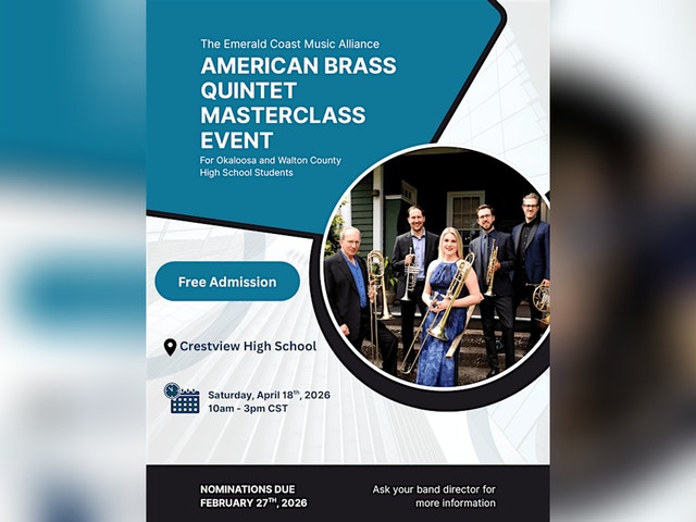 AMERICAN BRASS QUINTET MASTERCLASS Hey there, Okaloosa and Walton County High School brass music students! Don't miss this awesome chance to join the American Brass Quintet for a free hands-on masterclass. It’s all happening in person, giving you the perfect opportunity to learn directly from these internationally acclaimed professional musicians. See your Okaloosa or Walton county band director for information regarding nominations to be a participant or alternate at Crestview High School on Saturday April 18, 2026 from 10 am until 3 pm. Register here to reserve a spot for you and your family and friends to be audience observers. Admission for audience observers is also available at the door subject to space limitations. A limited number of high school brass quintets will also be selected to participate. See your band director for audition information.