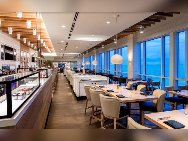 Beachy restaurant at the Lido Beach Resort, serving seafood and steaks with views of the Gulf or the ocean.