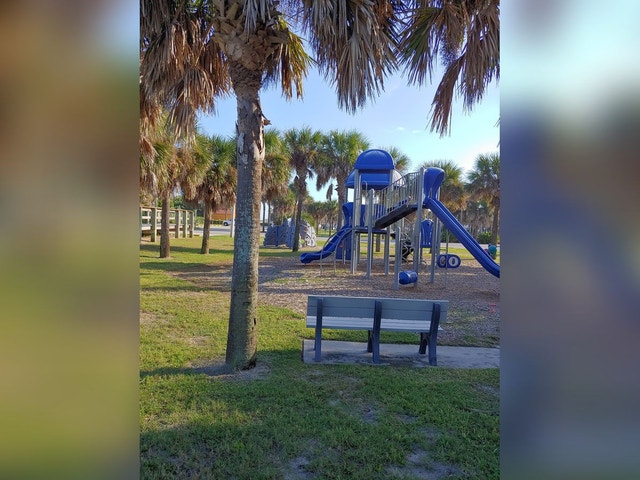 Beach and park with a playground and picnic tables, plus volleyball and restrooms.