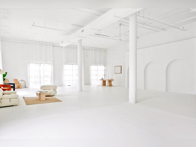 Clean studio with floor-to-ceiling windows, plus decor and sofas, for photo shoots.