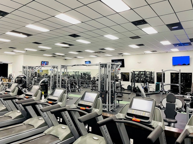 Fitness center featuring cardio and weight machines, plus free weights and group classes.