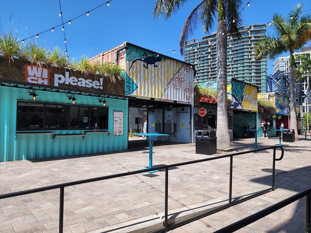 Modern waterfront area featuring hip restaurants & shops, a beer garden & street-food stands.