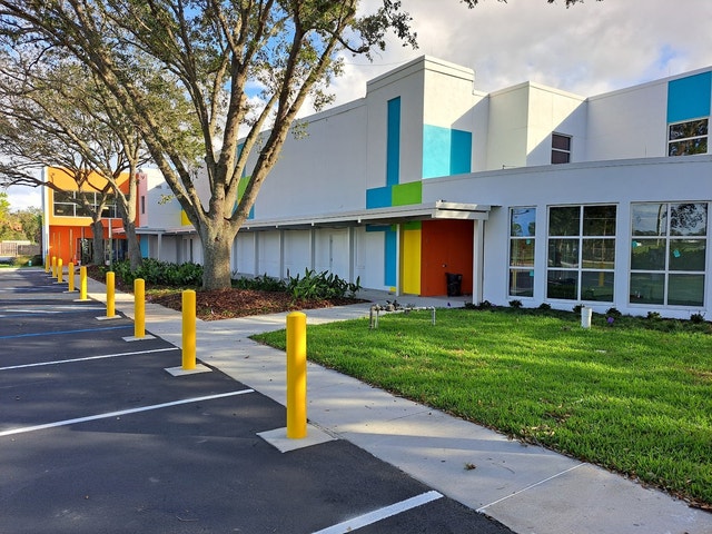 Recreation center with a skate park, basketball, volleyball, and pickleball courts, plus an art wing.
