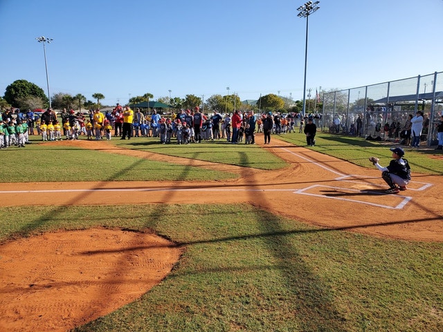 Baseball field with a children's playground and burrowing owls that come out at dusk.