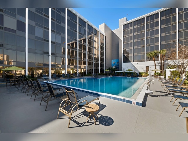 Casual hotel overlooking a water park, offering Universal Orlando discounts & a free park shuttle.