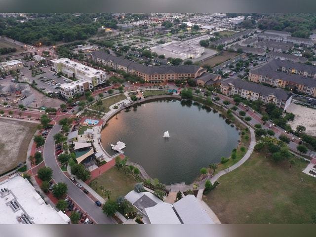 Park featuring a playground, lake with paddle boats, splash pad, and amphitheater, as well as food trucks.