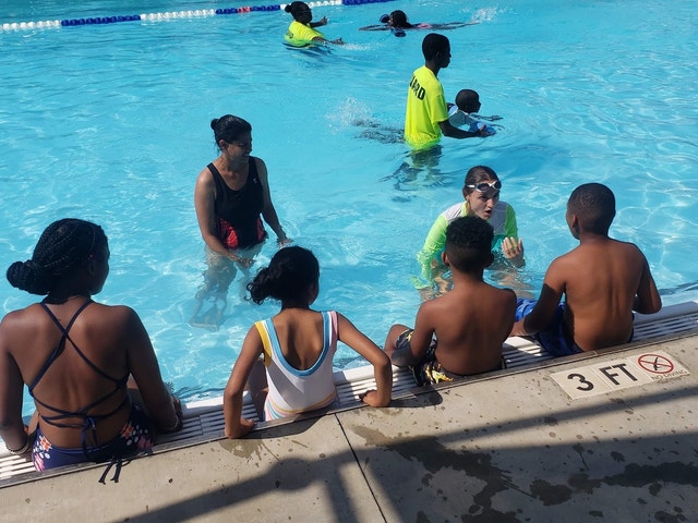 Family-friendly park space featuring courts for basketball and soccer, plus a playground and a pool.