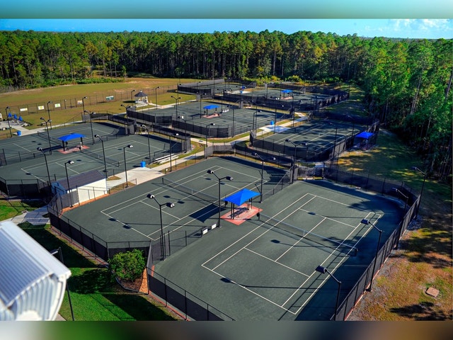 Recreation center with covered and uncovered tennis and pickleball courts, plus a dog park and walking trail access.