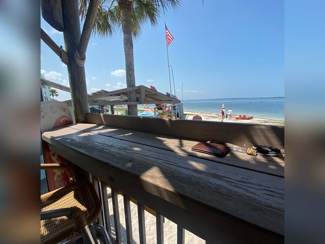 Open-air tiki hut serving drinks and comfort food while offering bay views.
