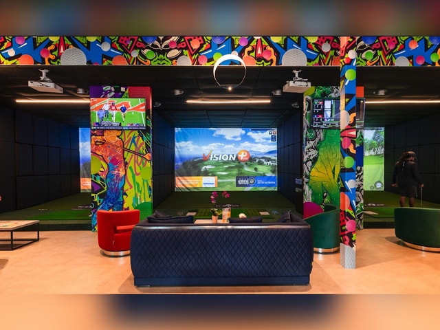 Indoor golfing facility featuring a simulator and a bar, plus a restaurant, and a golf shop.