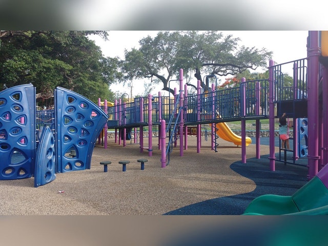 Compact neighborhood park with a baseball diamond, playground & grassy open space.