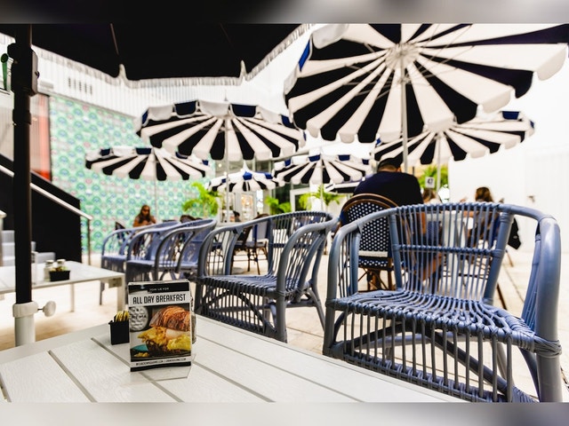 Coffee, smoothies, juices & light bites are served in a spacious wood-and-brick–trimmed setting.