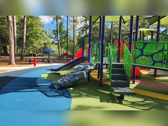 Colorful, inclusive playground featuring swings, a merry-go-round, and slides, plus picnic tables.