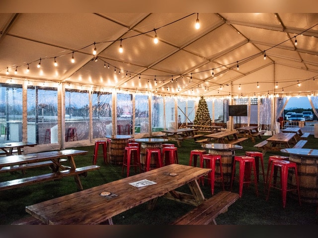 Casual bar & eatery featuring indoor and outdoor entertainment spaces with games and courts for sand volleyball and pickleball.
