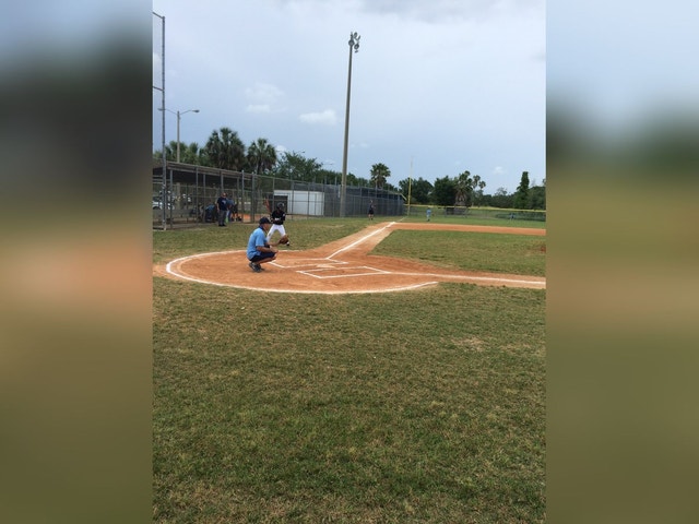 Park with a playground, baseball field, and swings and slides.