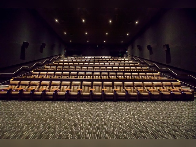 Sophisticated cinema with state-of-the-art technology, plush seating, and a restaurant.