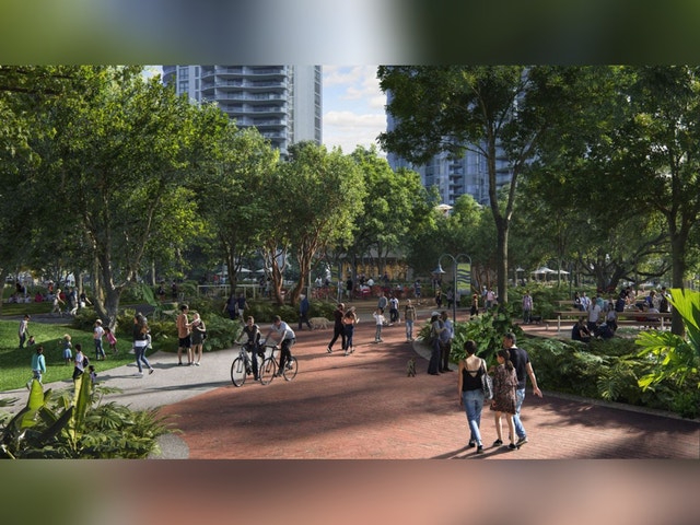 A large fountain anchors this riverfront park lined with walkways, picnic tables & benches.