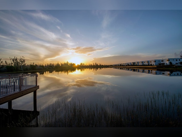 Green space with picnic tables, a playground, basketball and tennis courts, and a beach volleyball court.