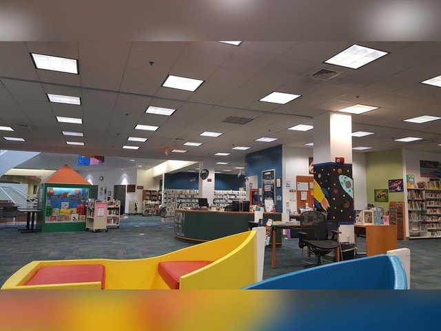 Public library with many books, study areas, and computers on a medium-sized college campus.