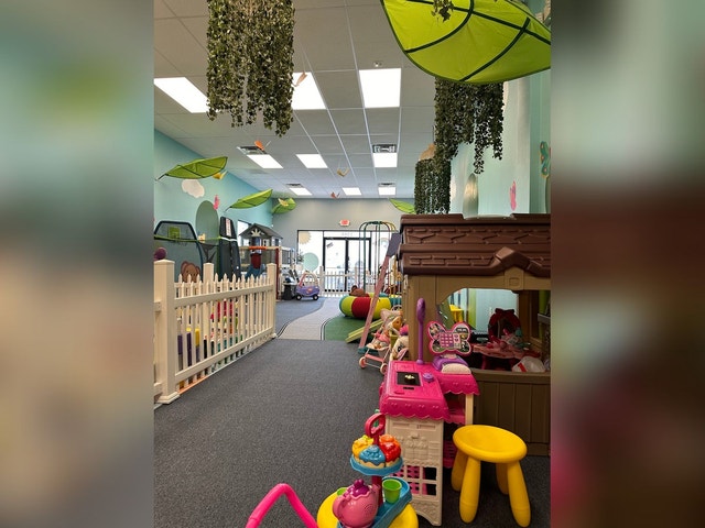 Indoor playground offering slides, dress-up clothes, and educational toys for ages 0–7.