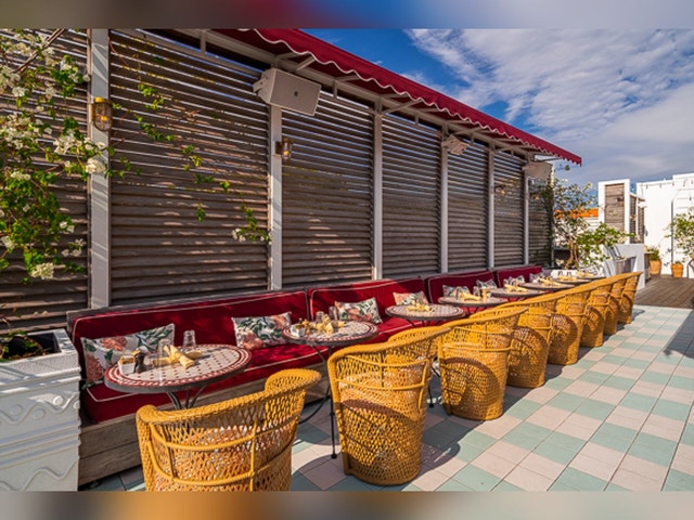 Rooftop bar at Esmé Hotel serving cocktails, wine, and beer, plus happy hour specials.