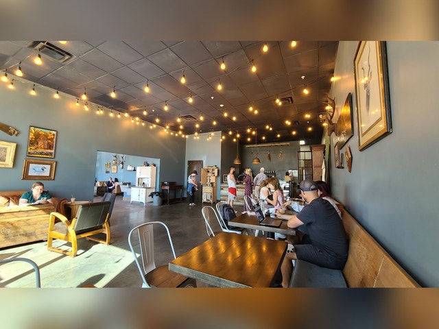 Comfortable coffeehouse offering ample seating and healthy options, plus a children's playground.