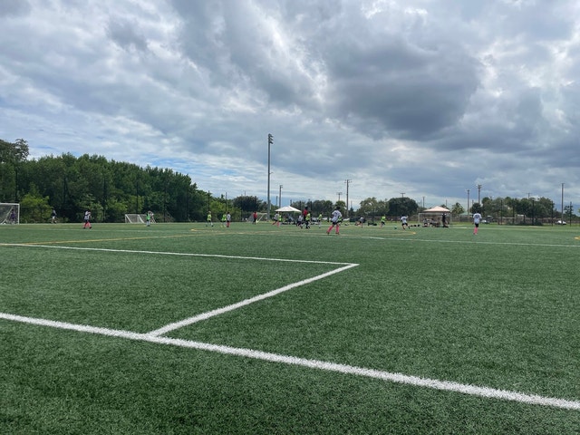 Relaxing public park with picnic tables, playgrounds and a baseball field for games.