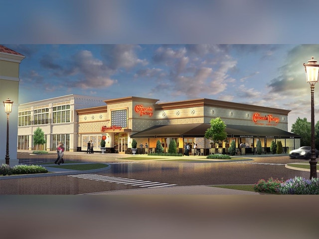 Open-air mall with shops, restaurants, and entertainment, including a movie theater.