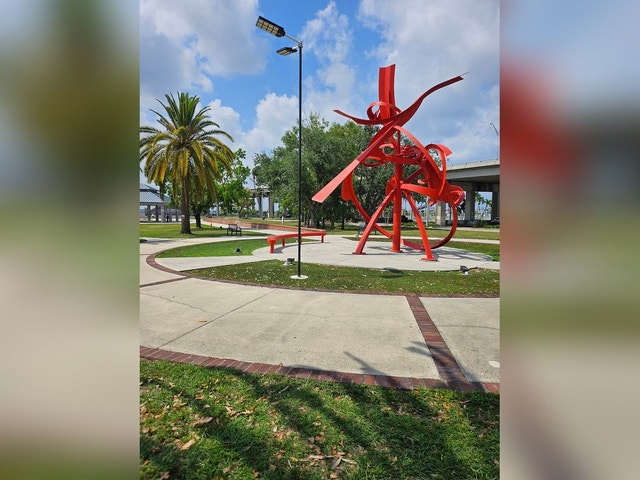 Public park along the Caloosahatchee River, with footpaths, public art, a pier & covered pavilions.
