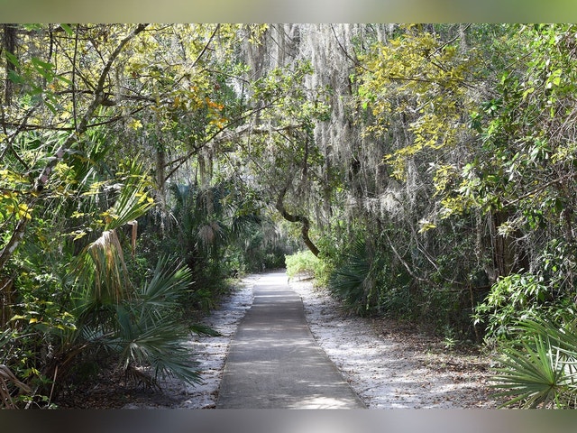Natural area with scrub and maritime hammock plant communities, trails, picnic tables, and a playground.