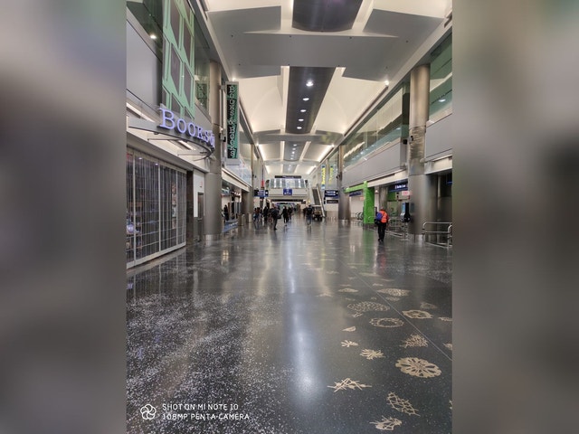 Airport hub established in 1928 features an on-site hotel & a wide range of art on display.
