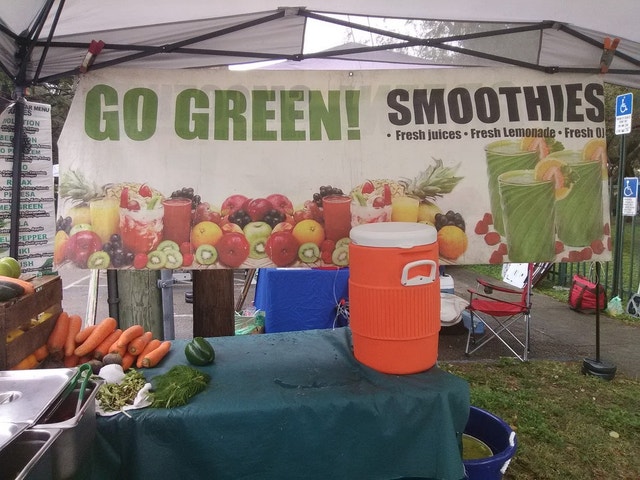 Outdoor farmers market featuring produce, homemade goods and a play area.