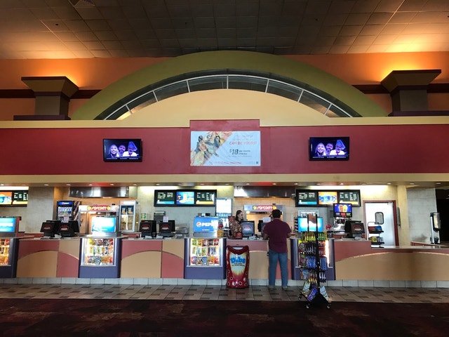 Theater complex with multiple screens featuring new release films, plush seating & concession stand.