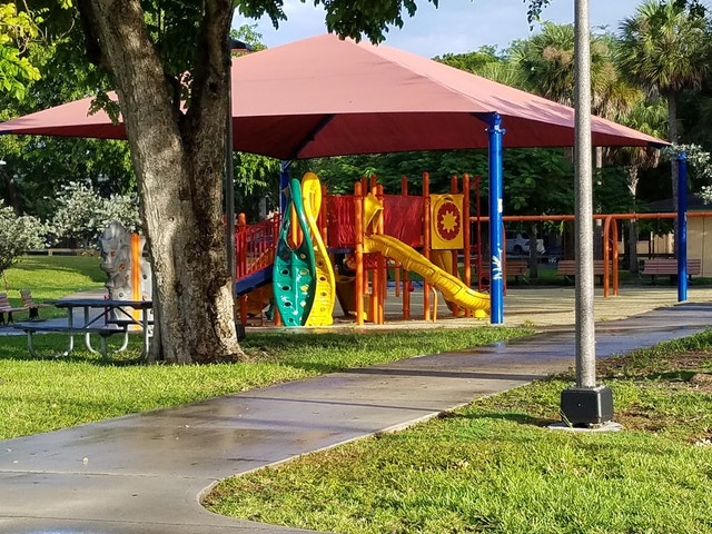 Lush park featuring playgrounds, a basketball court and a baseball field.