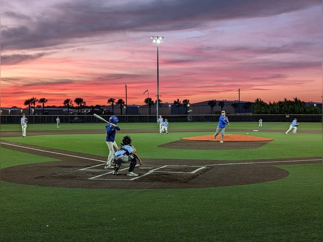 Sports complex with artificial turf fields for baseball, as well as a playground.
