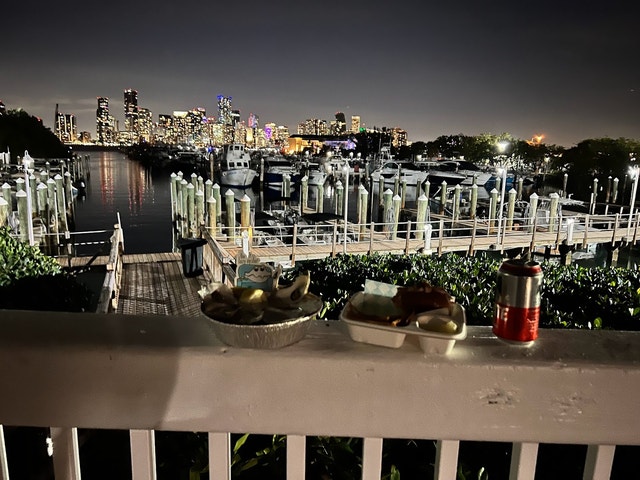 Waterfront bar at Rickenbacker Marina with live music, a raw bar, and views of the city.