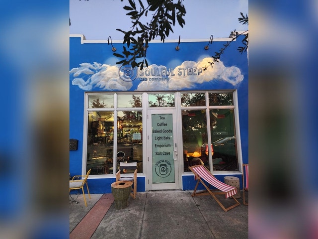 Tea and coffee served in a casual cafe with a playground, salt cave, and empanadas.