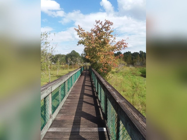 Park with a paved trail around a lake, as well as picnic shelters and a boardwalk.