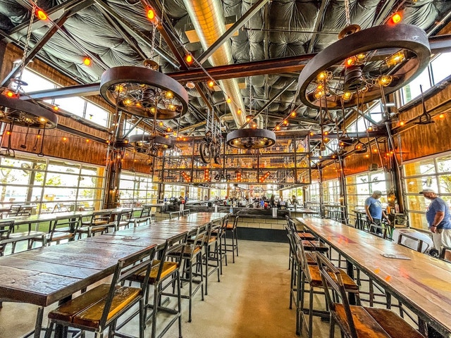 Outdoor venue with a Ferris wheel, food trucks, and fire pits, plus live music, and dog park.