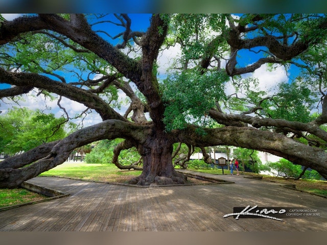 Community park centered on an oak tree that's more than two centuries old, with a 25-foot trunk.
