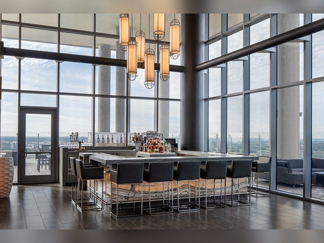 Scenic, adults-only rooftop bar with floor-to-ceiling windows, furnishing small plates & cocktails.