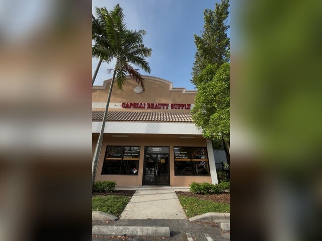 Beauty and barber supply shop stocked with products and equipment.