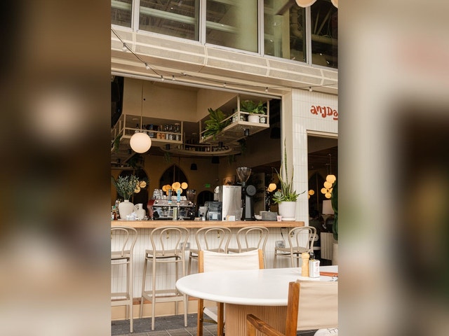 Relaxed spot showcasing Mediterranean eats, grilled options, cocktails and coffee, plus outdoor seating.