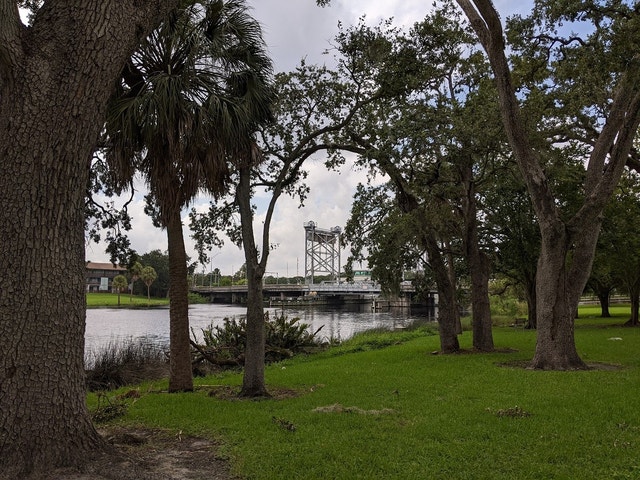 Park with a river featuring a drawbridge, plus benches and space for walking.