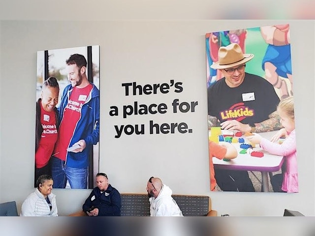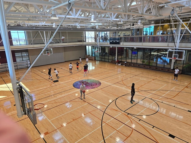 Recreational center with a gym, an indoor track, a kids' club, a splash pad, and outdoor athletic courts.