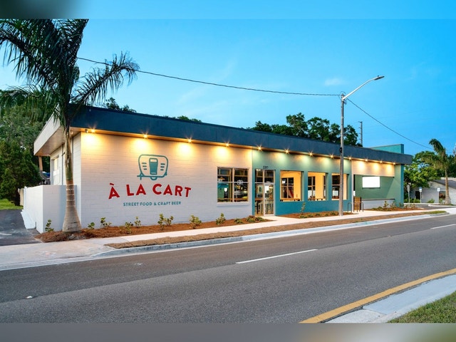 Outdoor pavilion featuring rotating food trucks, a selection of craft beers, and covered indoor seating.