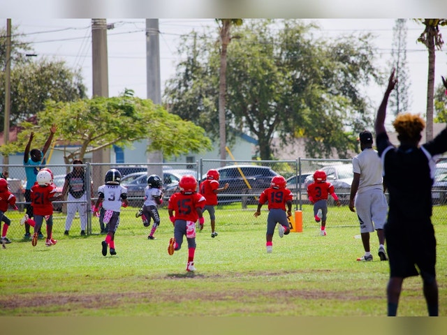 Outdoor area with playground, picnic tables, and facilities for football, baseball, basketball, tennis, and track.