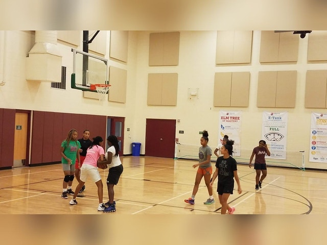 Recreation center with a basketball court, splash pad, and outdoor space, plus dance classes.