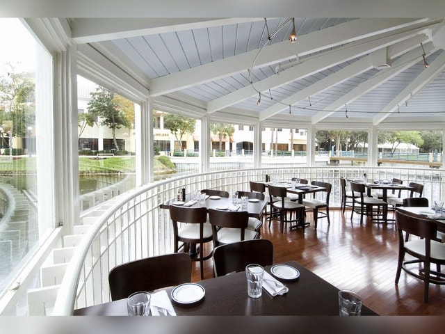 Airy seafood restaurant with lake views & a nautical vibe amid blue & white decor.